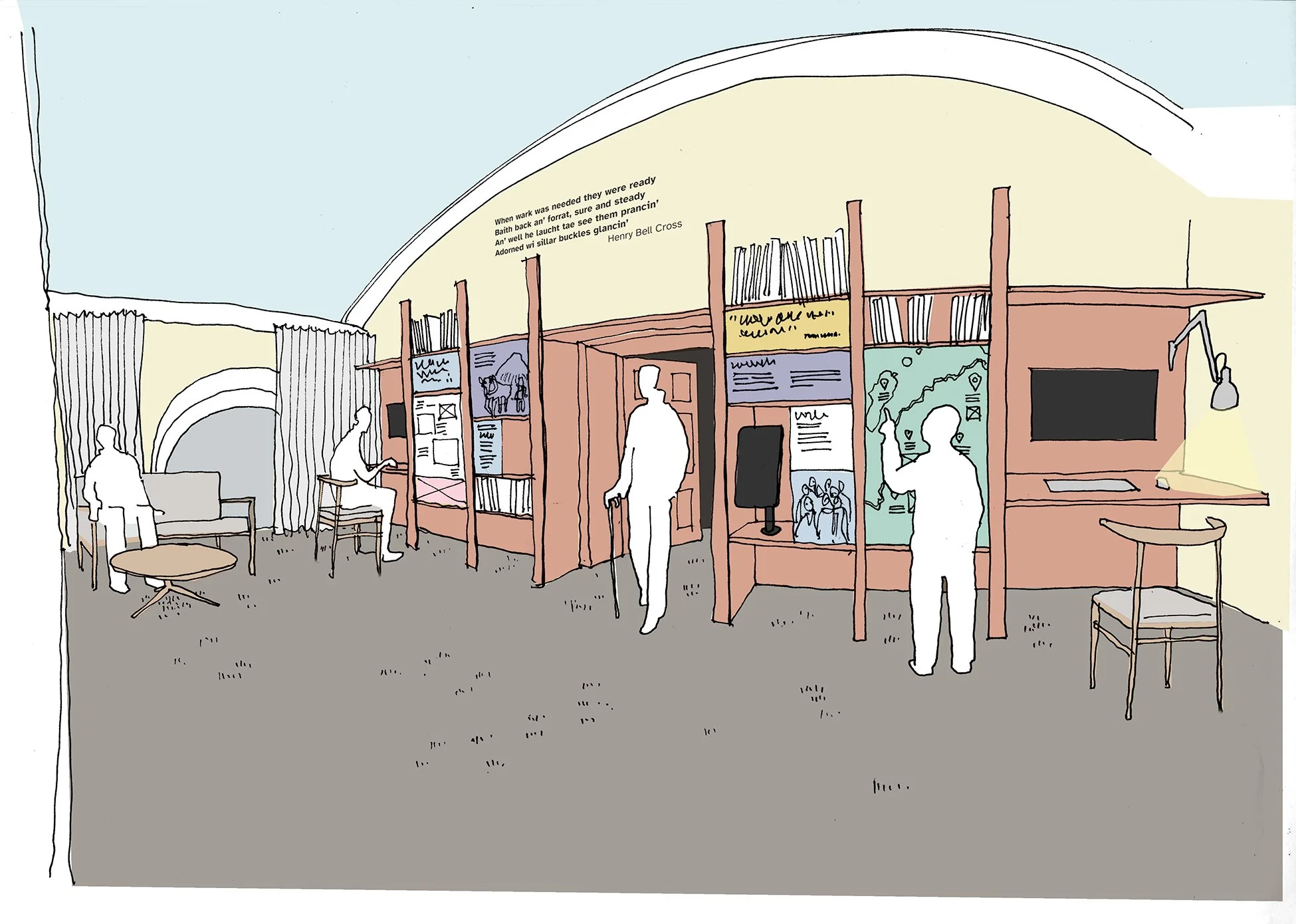 Swiftly costing up the project and nominating subcontractors for joinery, graphic and digital production we costed the project immediately and laid out the project schedule, revolving this around engagement sessions and other key milestones to ensure success. Having spent some holidays at the manse, directly beside the Kirk, we’re really happy to see the community have a lovely, engaging space for the future.